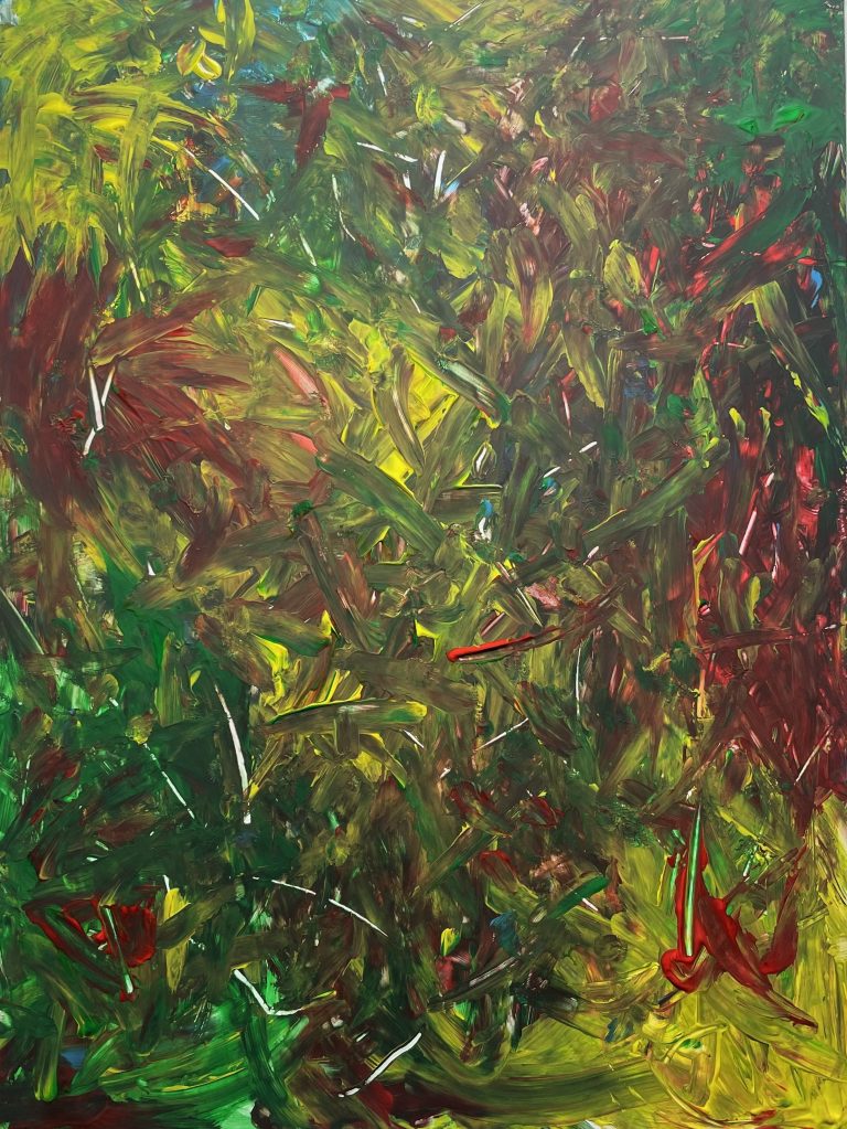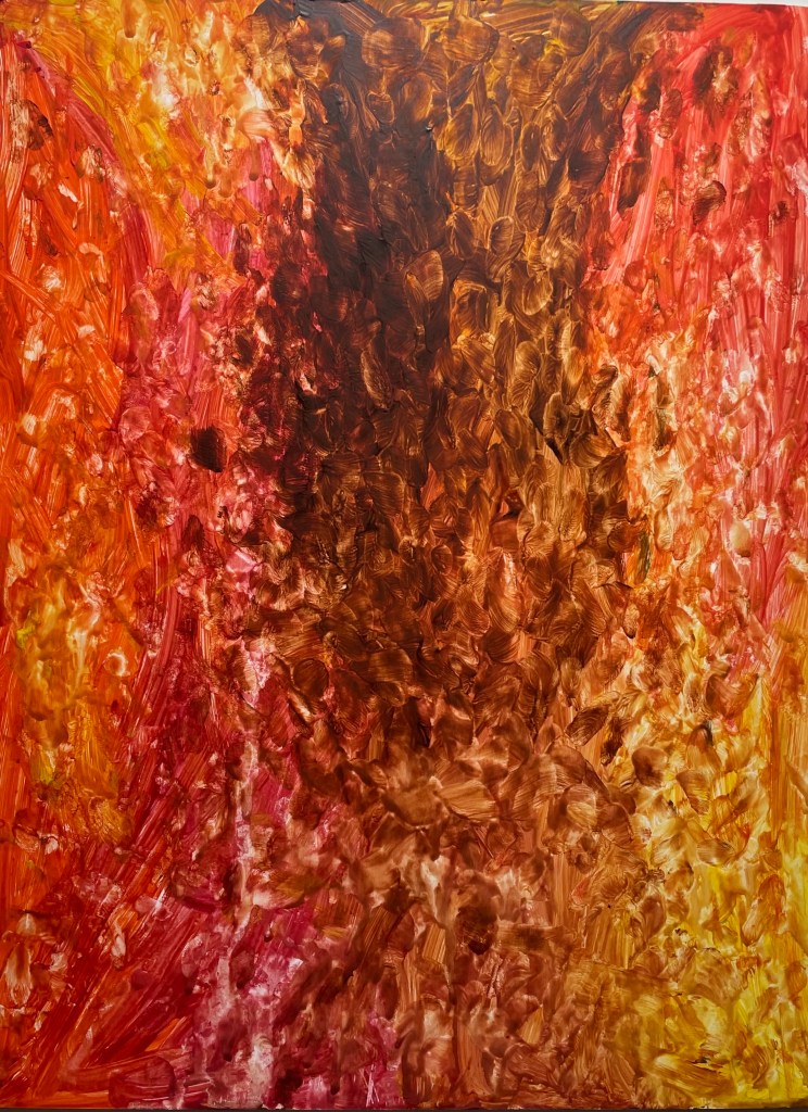I picked up acrylic paint and sat opposite a sheet of card and made a mess. I embraced the loss of control and the spontaneous, erratic, playful process as I dipped my fingers into pots of primary colours and pressed them, without thought, into the surface. Immediately, I was inspired. Seeing the muddied colours merge and abstract shapes develop with each new and uncontrolled strike at the cardboard was thrilling.